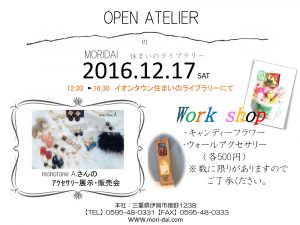 12月17日(土) 12:30~16:30 イオンタウン住まいのライブラリーにて^^ ★OPEN ATELIER monotone A.さんのアクセサリー展示・販売会★Wark shop(各500円) ・キャンディーフラワー ・ウォールアクセサリー キッズスペースもありますのでお気軽に遊びに来てください♪