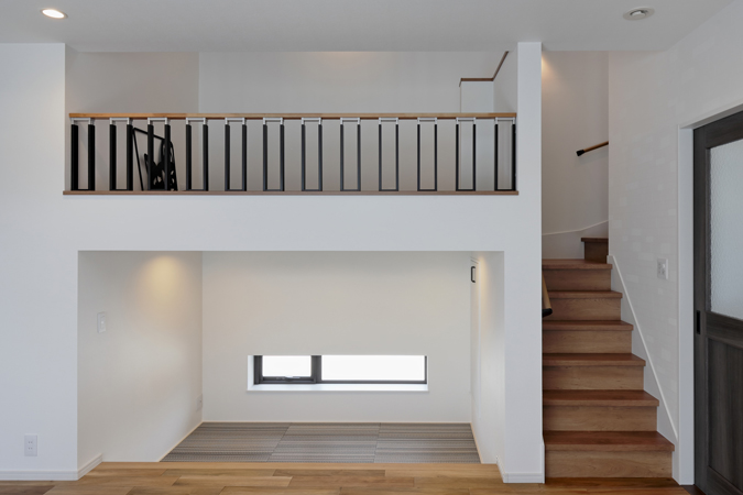 リビングの畳コーナーは一段下がり、隠れ家、秘密基地のような楽しくも落ち着きのある空間に。