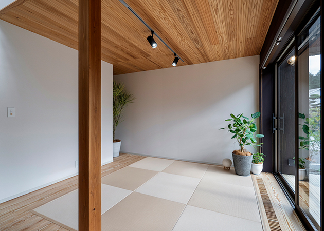 外観のベースはウッドロングエコ塗装の杉板張りで、玄関部や場所に合わせて張り替え。