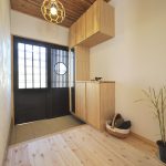 自然素材のやさしい雰囲気に、和のテイストの玄関ドアや照明がマッチ。床は無垢のパイン材を採用。